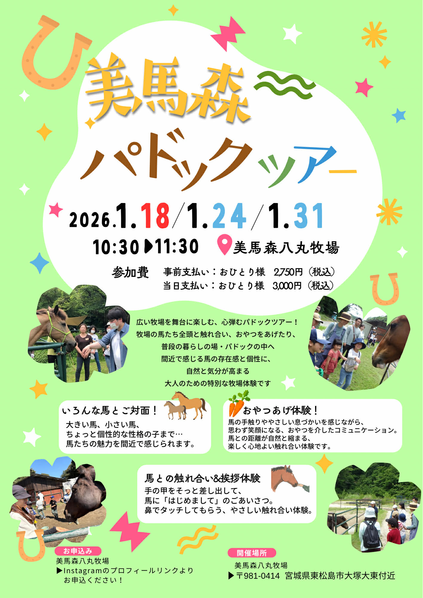 ・内容 牧場案内のガイドのもと、馬に関するオモシロ話を聞きながら馬たち全頭とふれ合って餌付け体験を楽しむ牧場ツアーです。