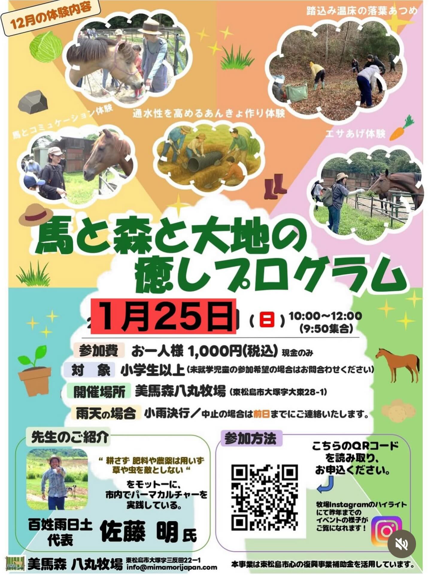 美しく健全な馬たちで美しく健全な森をつくり、そんな森と里山に見守られながら、資源循環型の地球にやさしい暮らしや自然との共生が実感できる各種プログラムを豊富にご用意しております。訪れた方々が笑顔になったり癒されたり、また真の豊かさや幸せについて改めて想い巡らせるきっかけになれば嬉しい限りです。